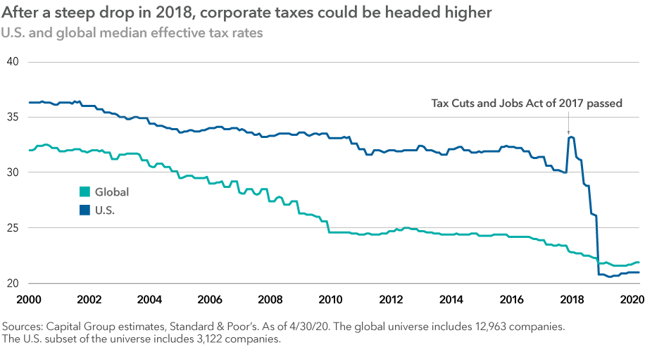 One result could be a full or partial rollback of the Tax Cuts and Jobs Act of 2017, which included significant tax reductions. Overall corporate tax rates declined from 35% to 21%, providing a major boost to corporate earnings. A full or partial reversal would have the opposite effect, prompting investors to take that into account when estimating the overall corporate earnings outlook.